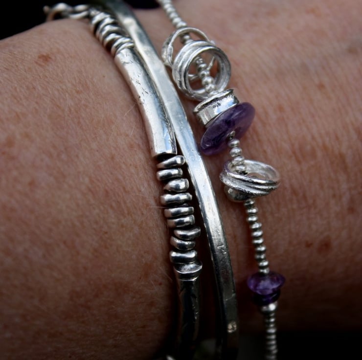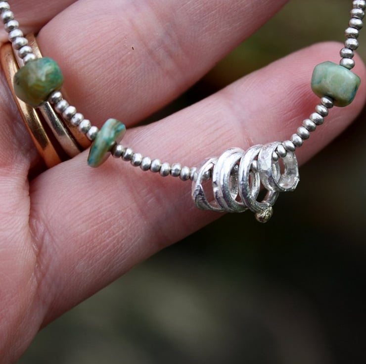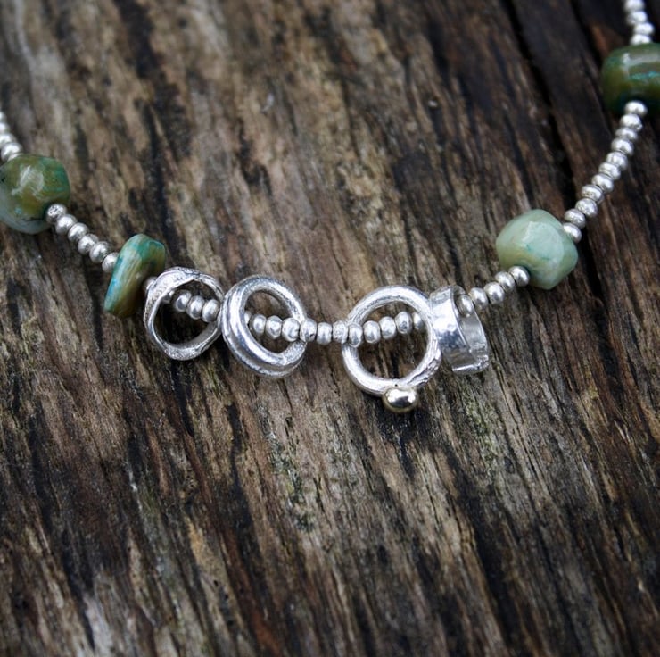 I have combined small 2 mm-ish solid silver beads with a selection of Peruvian opals and in the central section I have added 4 fused textured slider beads, one has an 18 ct gold bobble .