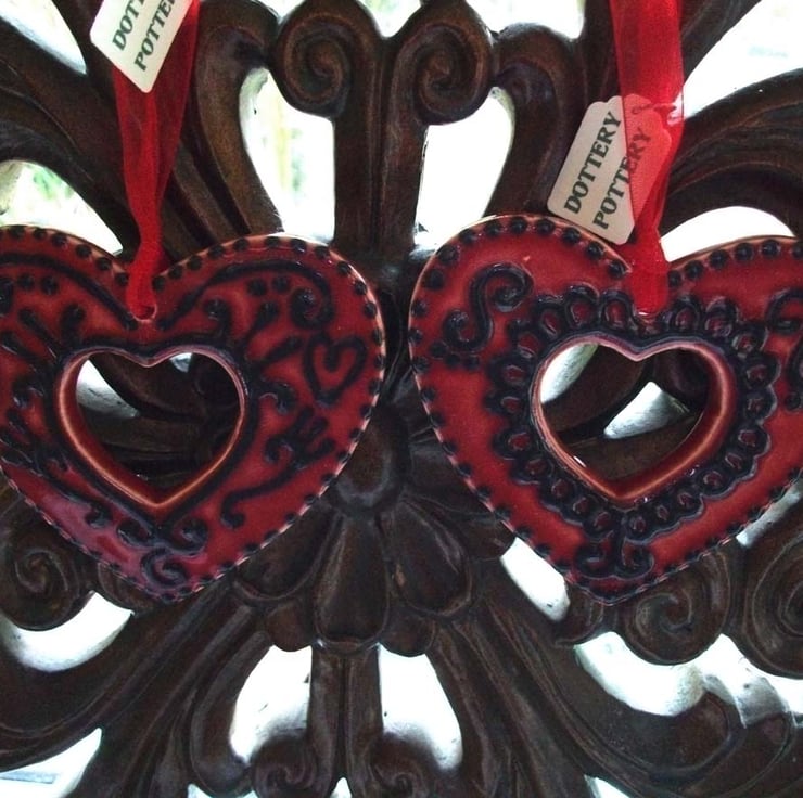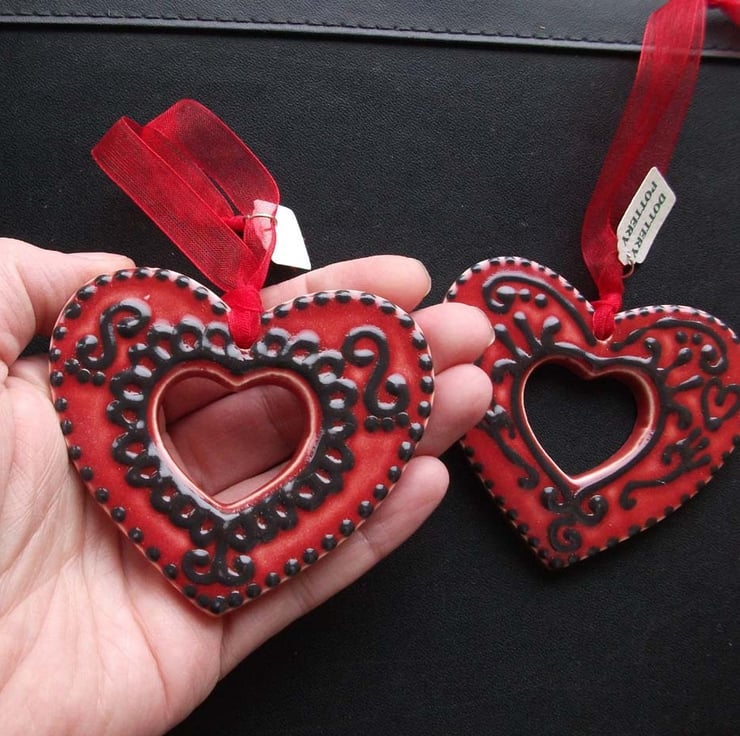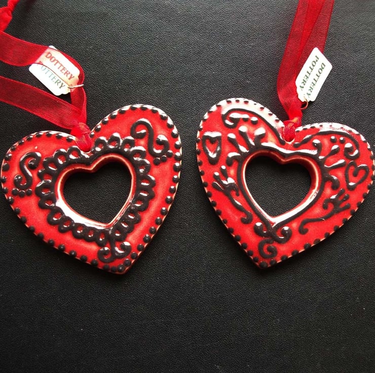 These two little hearts have been cut from white earthenware clay and decorated with a bold black pattern. They have then been finished with a rich, glossy glaze and twice fired to a top temperature of 1100 degrees - so they are nice and strong.