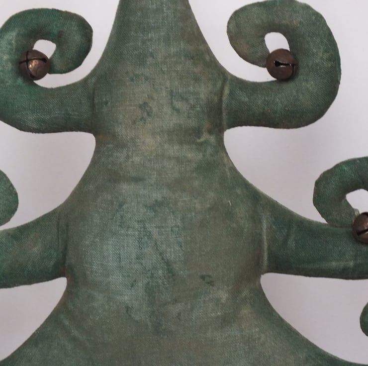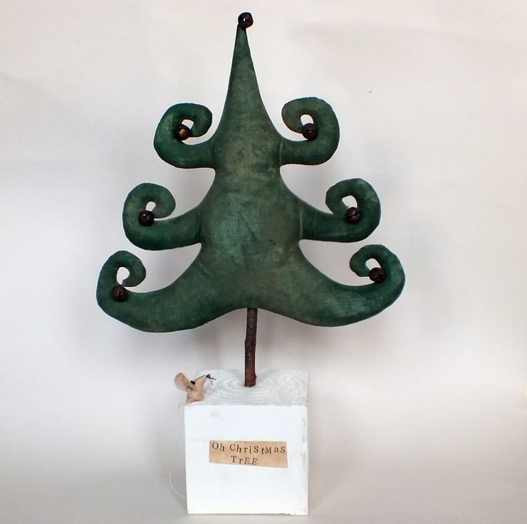 .... is made from randomly painted linen , sanded ,coated in coffee then dusted with cinnamon. The trunk is a piece of twig (quite chunky and sturdy) which has been glued into the tree and the base.The branch ends are finished with rusty bells.