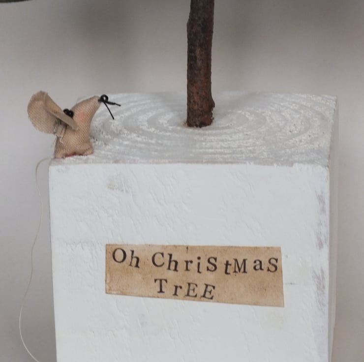 The base is a block of unplaned wood, that i have sanded ,painted , then repeated ,so that is relatively smooth .The tiny 3cms. mouse is singing quietly 'Oh ,Christmas Tree ,Oh Christmas Tree .....'