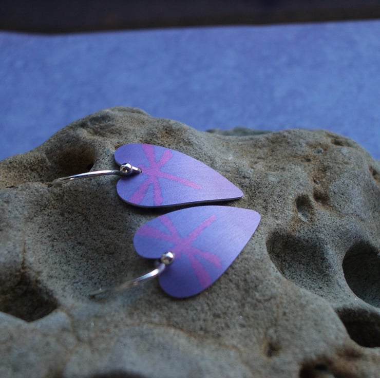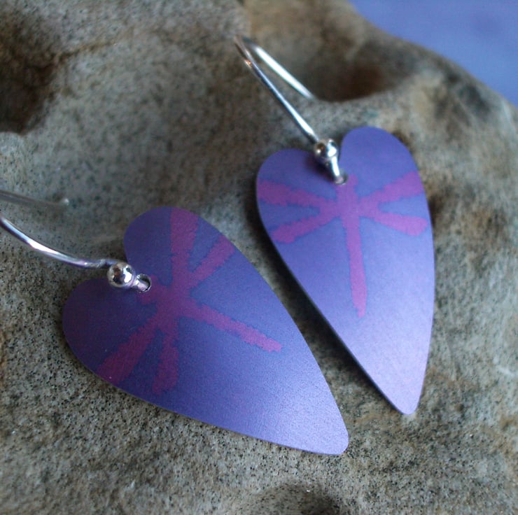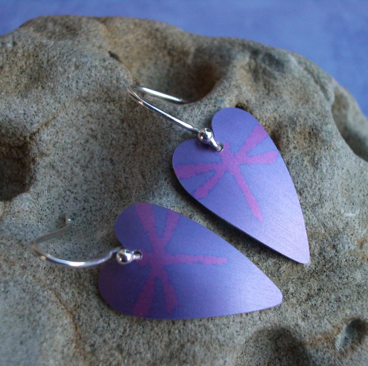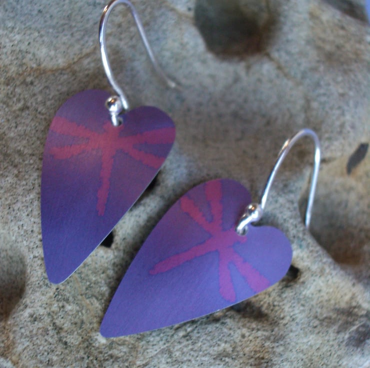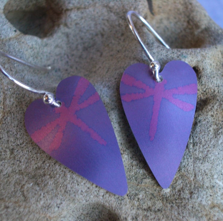 These sweet little heart earrings are made from aluminium which I have dyed in a mix of colours achieving a pretty purple background with subtle pink dragonflies. I then seal them so that the dye becomes a permanent part of the metal. I cut out the heart shapes by hand, using a piercing saw, then dome them so that they catch the light.