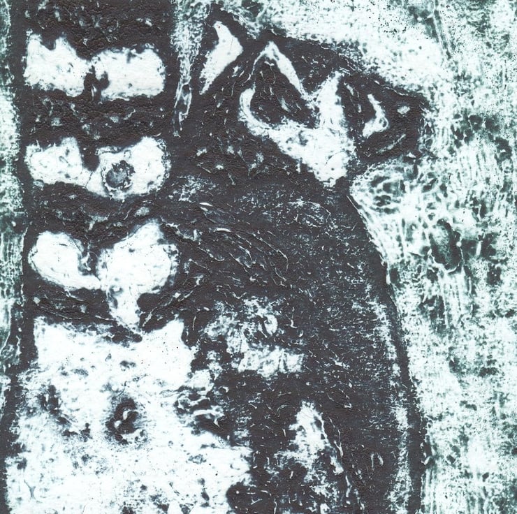 Hand printed on watercolour paper in blue/black and green oil based ink. Hand printed on an intaglio printing press on my dining room table!