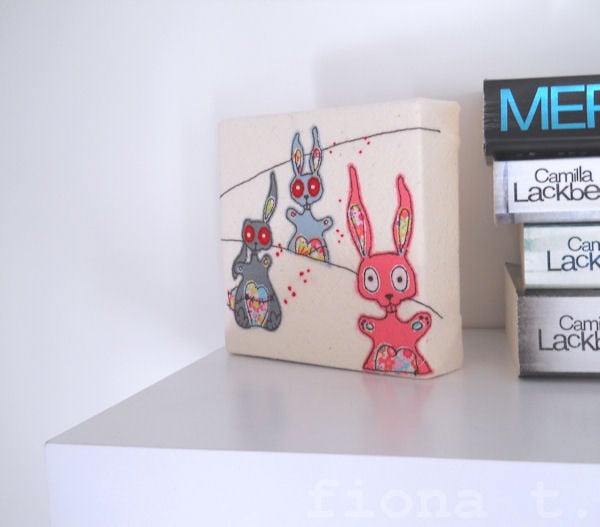 this piece features an anxious applique bunny being pursued by two (slightly bewildered looking) zombie rabbits.