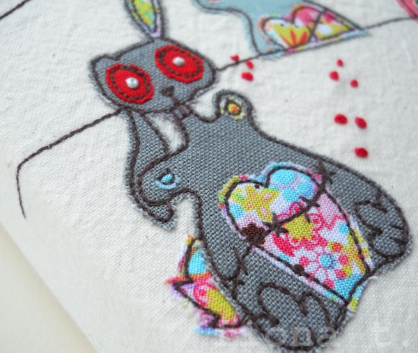 this embroidery has been entirely handmade by me on a domestic sewing machine, the bunnies are based on original drawings by Little Black Heart.