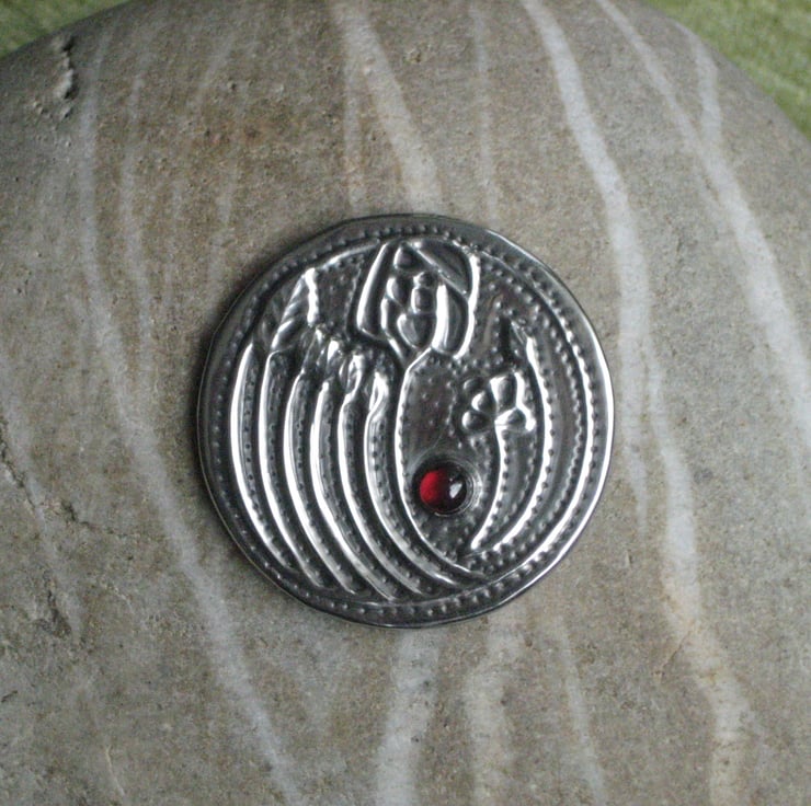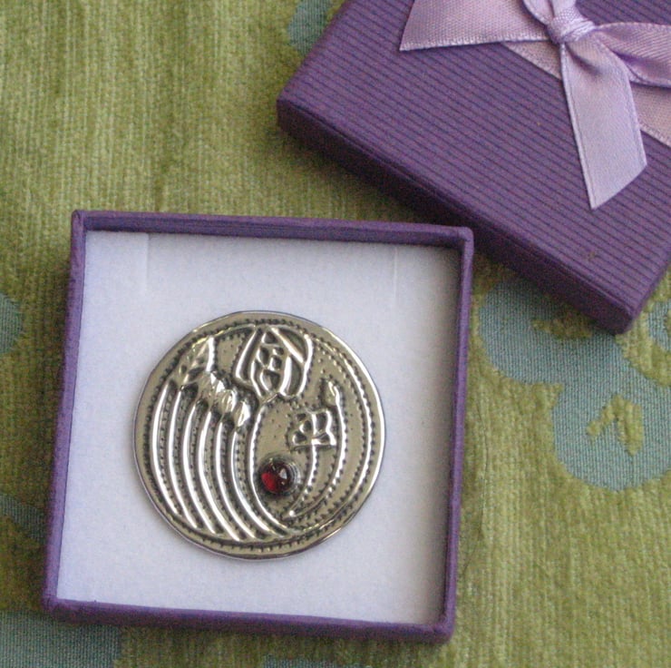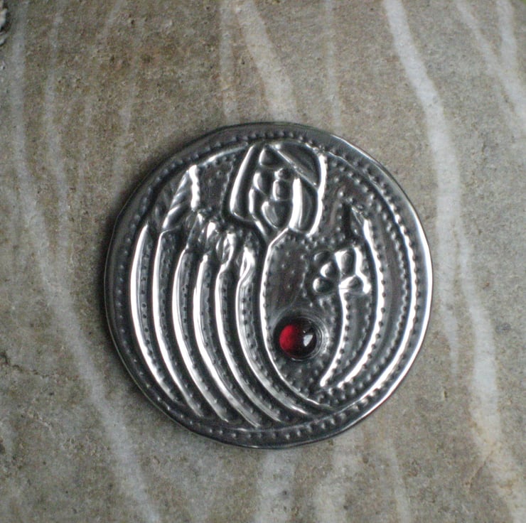 This brooch has been handmade, in the style of Charles Rennie Mackintosh, in shiny lead-free pewter and features a genuine garnet cabochon. It measures 37mm diameter and has a 30mm pin with safety catch on the reverse. In spite of its size, it is light in weight.Gift boxed.