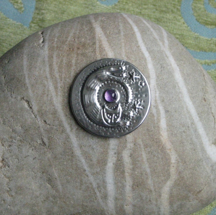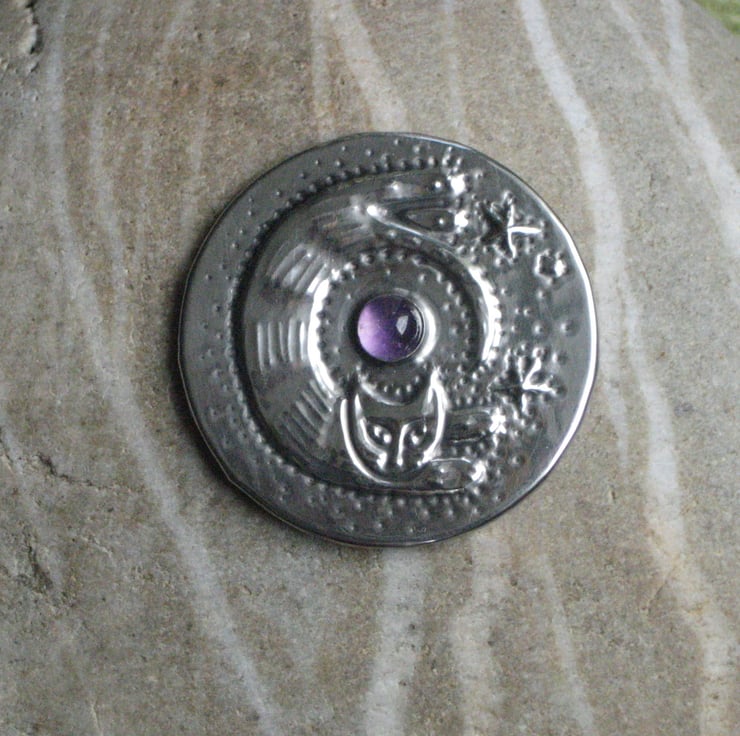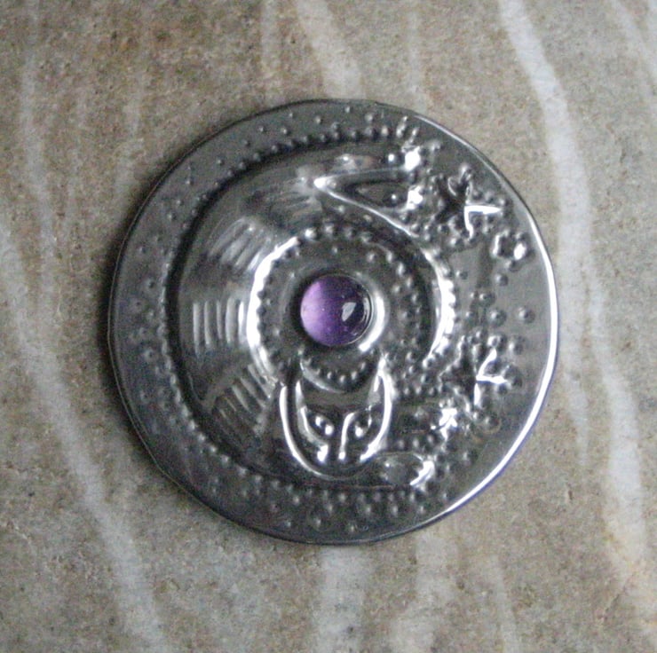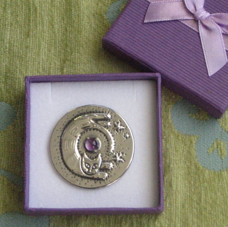 This brooch has been hand-made in shiny modern pewter, and features a genuine amethyst cabochon. It measures 40mm,1.5 ins across and has a 25mm pin with safety catch on the reverse. Comes gift boxed.