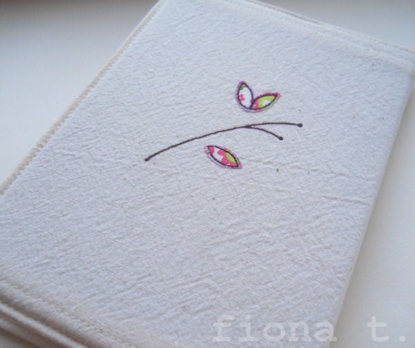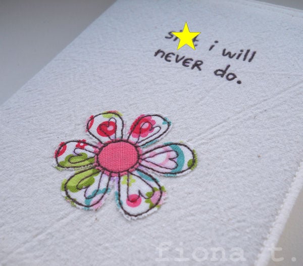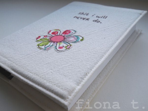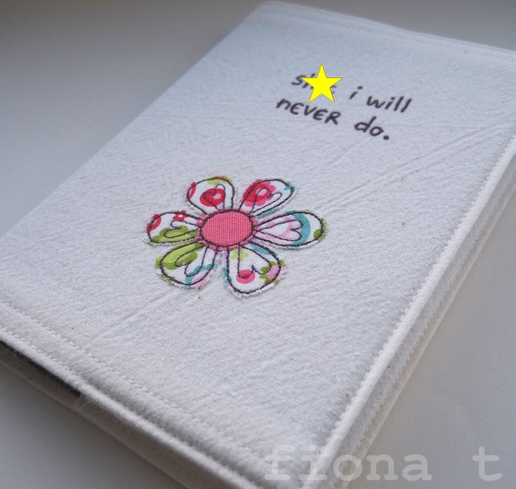 the words “stuff i will never do” is free machine (free motion) embroidered on the front cover, along with a bright & cheerful applique flower, and there's a sprig of tiny leaves on the reverse.
