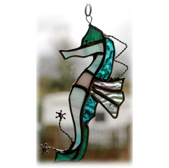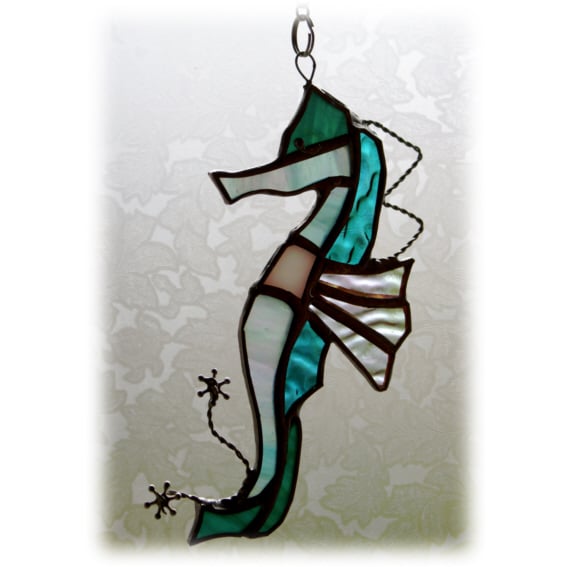 The seahorse hangs from a little chain which is securely attached to the top. It is 6 inches tall and 3.5 wide.