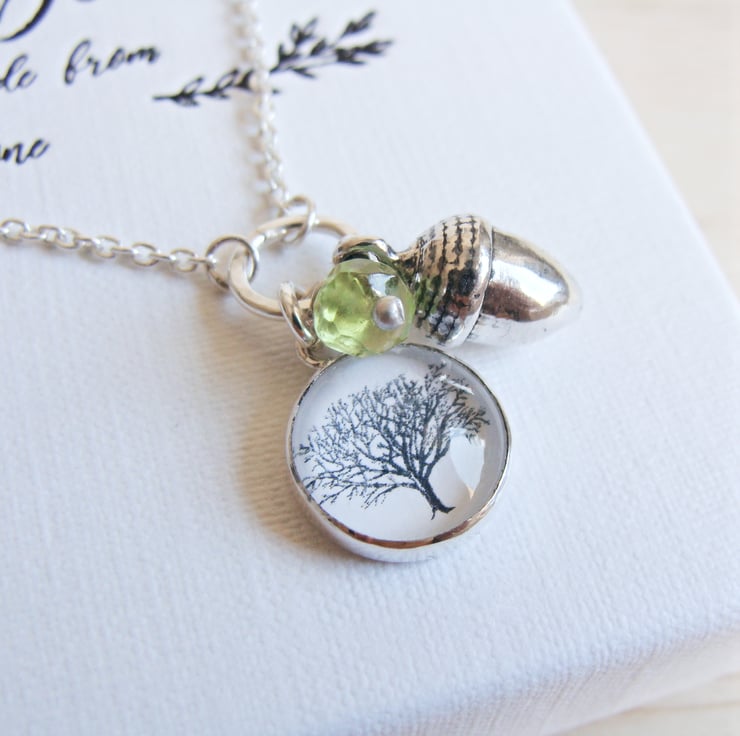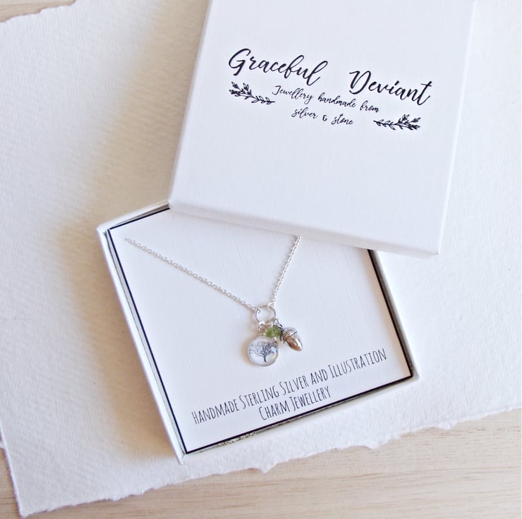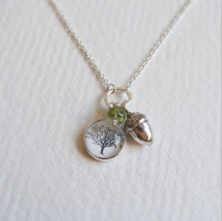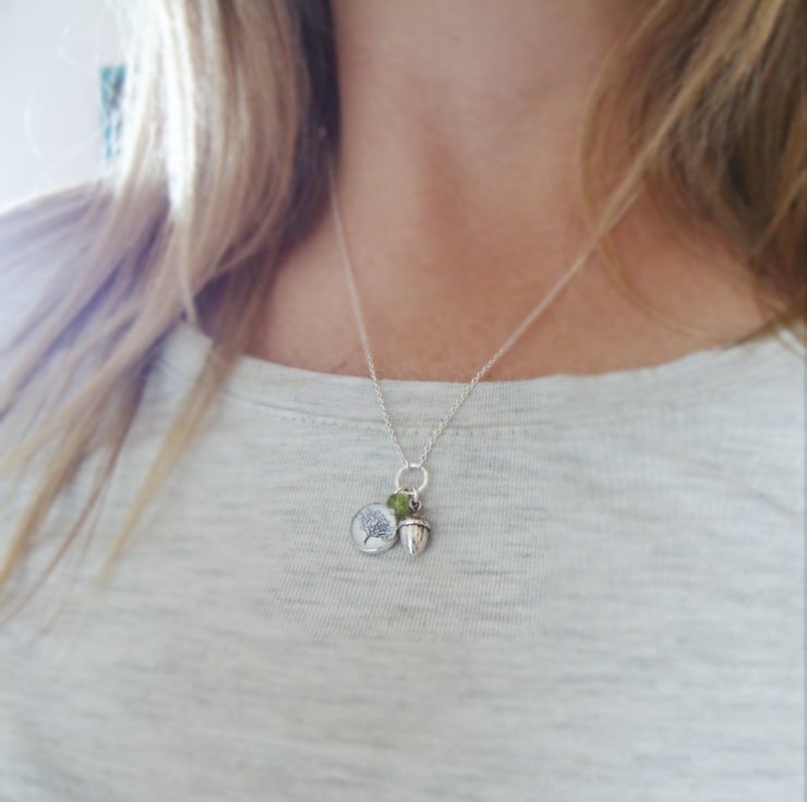 This sterling silver necklace features a cluster of charms including a solid silver acorn, an illustrated tree charm and a spring green faceted peridot gemstone bead. They all hang from a small, hammered silver loop that attaches to a sterling silver chain.