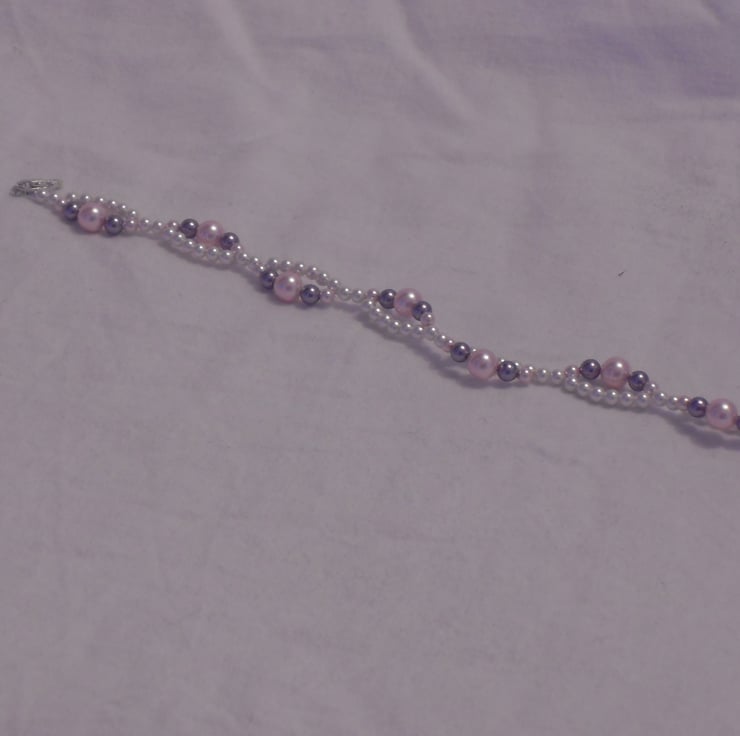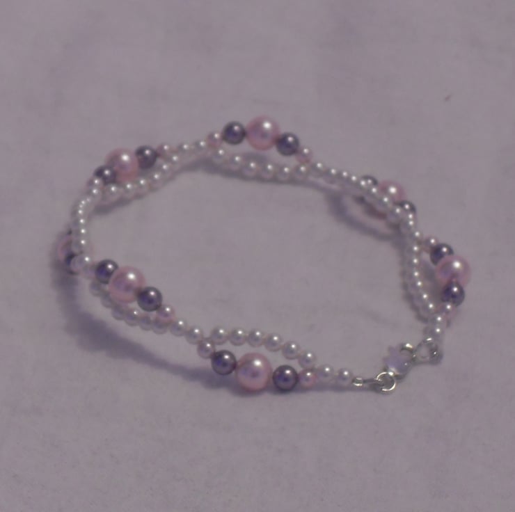 Made to order. A beautiful pearl bracelet. Waves of rosaline pink (3mm and 6mm) and mauve (4mm) crystal pearls sweep from a string of 3mm white crystal pearls with sterling silver clasp. Presented in a pretty amethyst and ivory box with a magnetic closure. Matching earrings and necklace available.