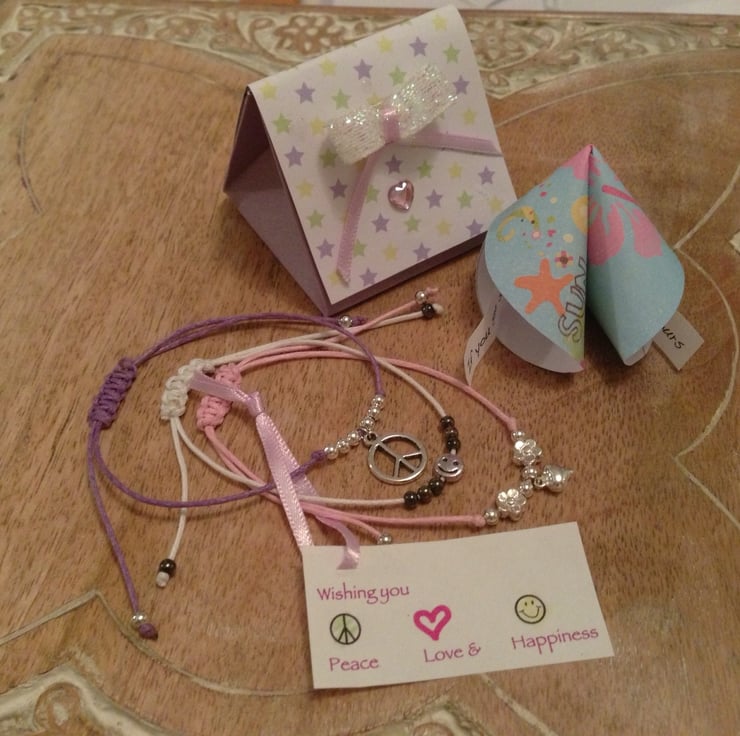Set of three friendship bracelets, each made with 1mm cotton cord, one representing peace, another love and another happiness.