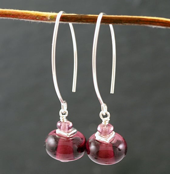 Contemporary ear rings with Sterling Silver over-sized ear wires. The ear wires are hallmarked .925 and are 30mm long, just over an inch. At the end is a hand made glass bead. Velveteen gift bag included.