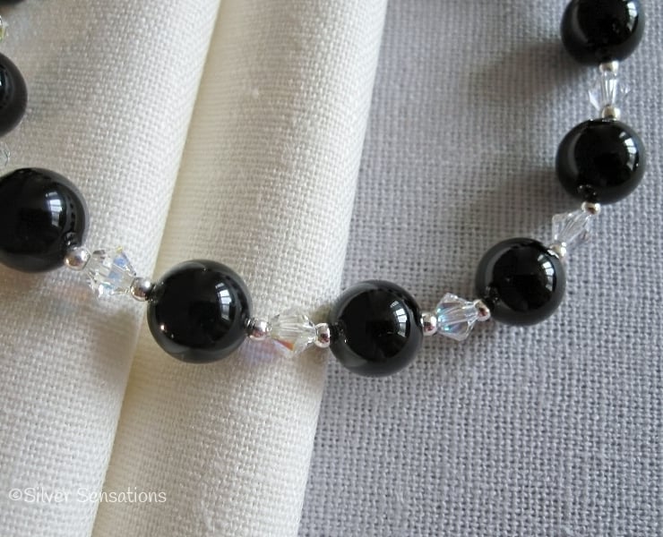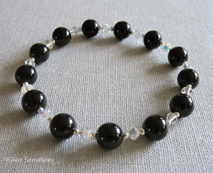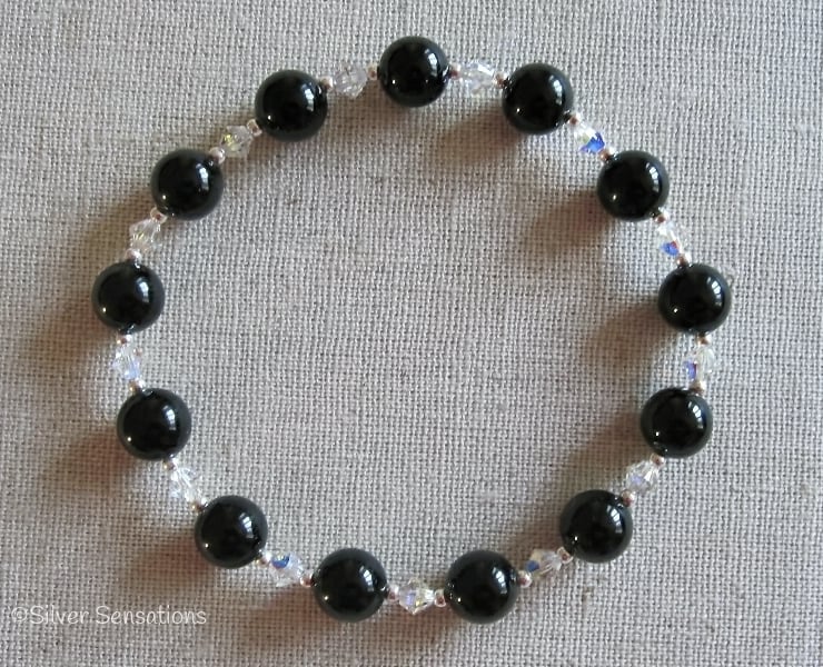 This striking hand crafted stretch bracelet has been created using Black Onyx 8mm round beads with very sparkly rainbow Swarovski Crystals.