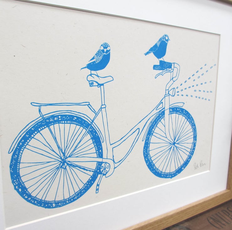 'Night Ride' shows 2 little birds having an an adventure the art print has been hand screen printed with eco-friendly inks onto 100% recycled straw paper.
