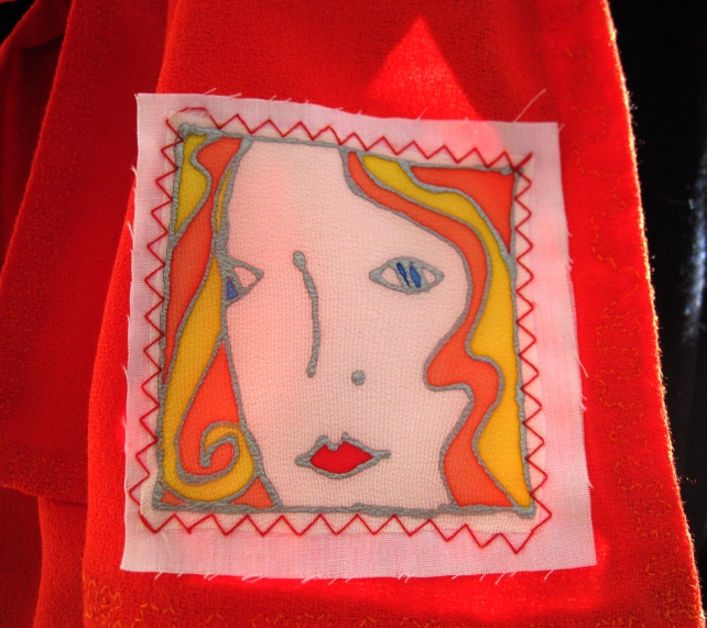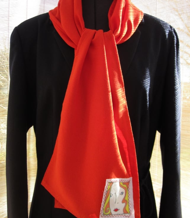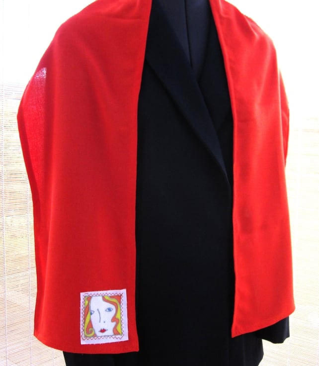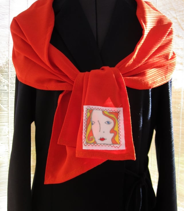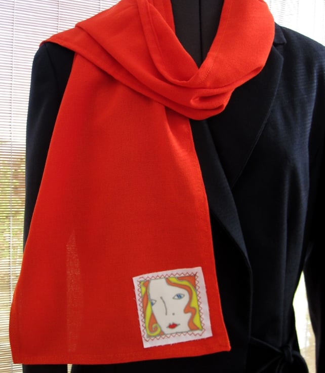 Liven up an outfit with this unique, vivid orange, single layer, fabric scarf, with a hand painted, portrait detail on a silk panel. The scarf is 147cmx 25cm.