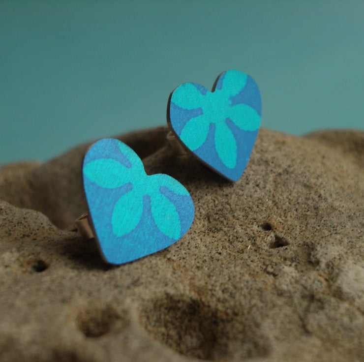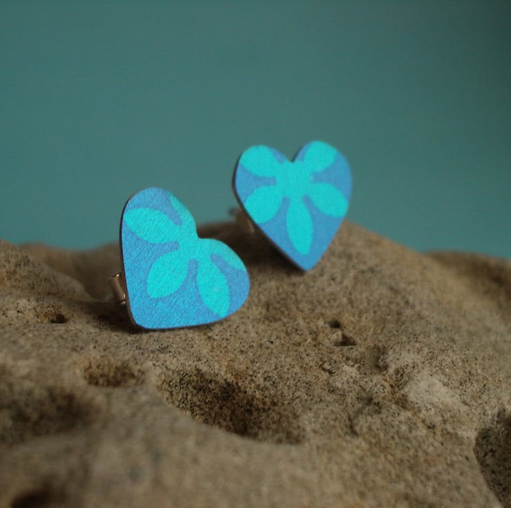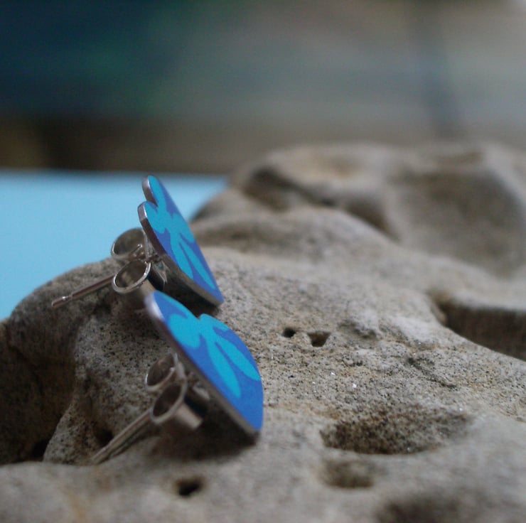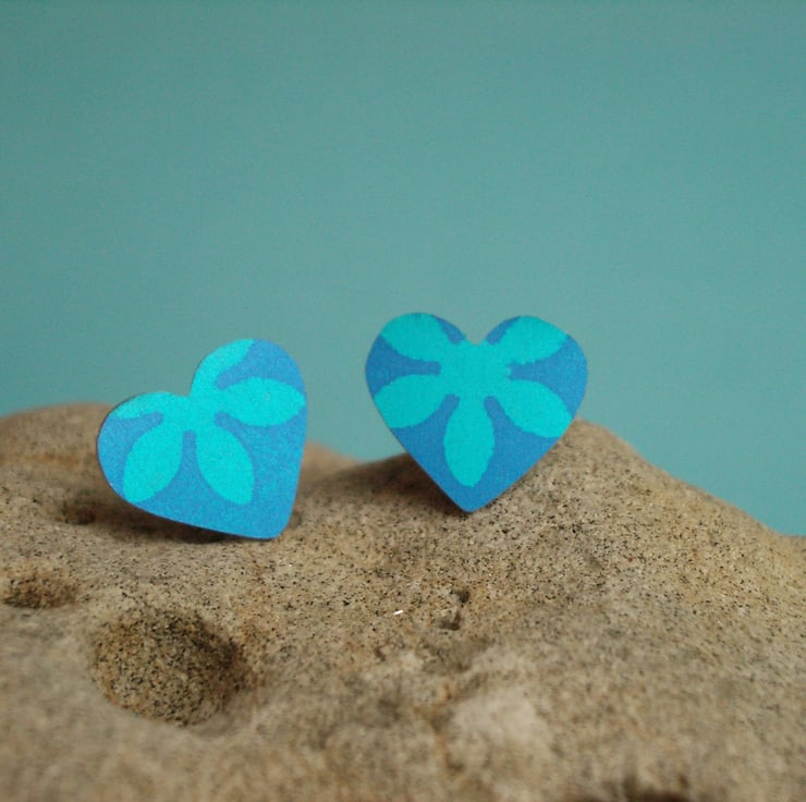 These cute little heart earrings are made from aluminium which I have dyed turquoise and blue, creating a flower pattern. I then seal the dye so that it becomes a permanent part of the metal. I saw pierce the heart shapes by hand and attach sterling silver flatpad earring studs.