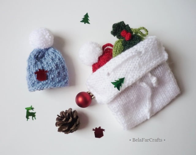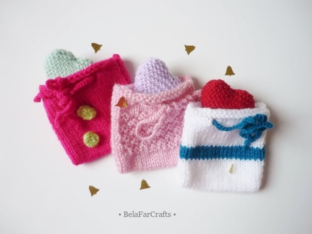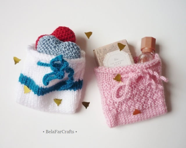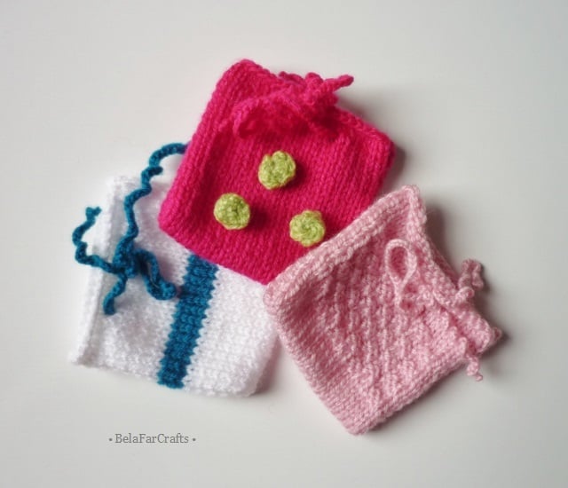 The pouches measure about 10cm x 10cm (4in). I hand knitted them using soft and fine acrylic yarn that is available in many colours and is easy to care for.