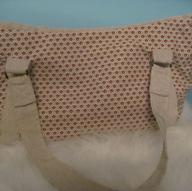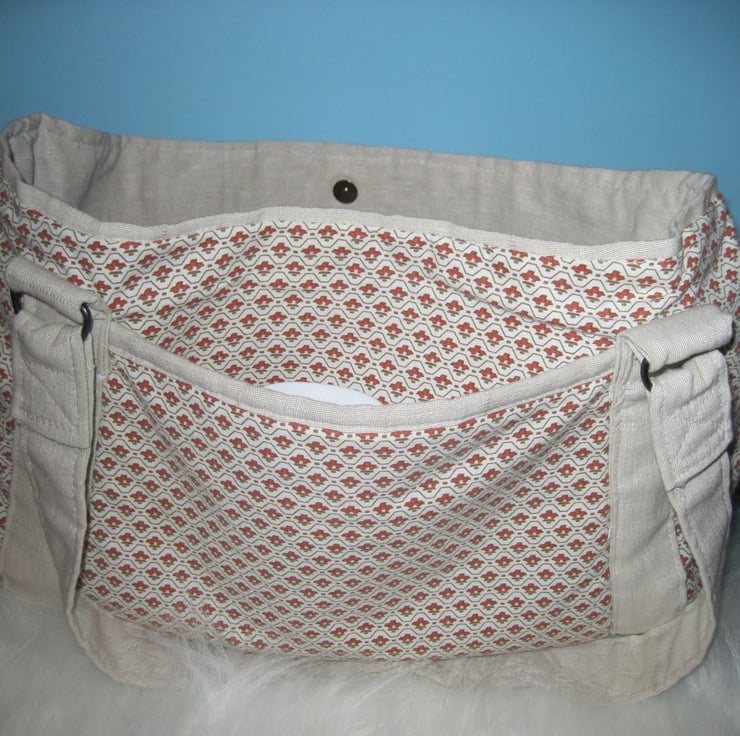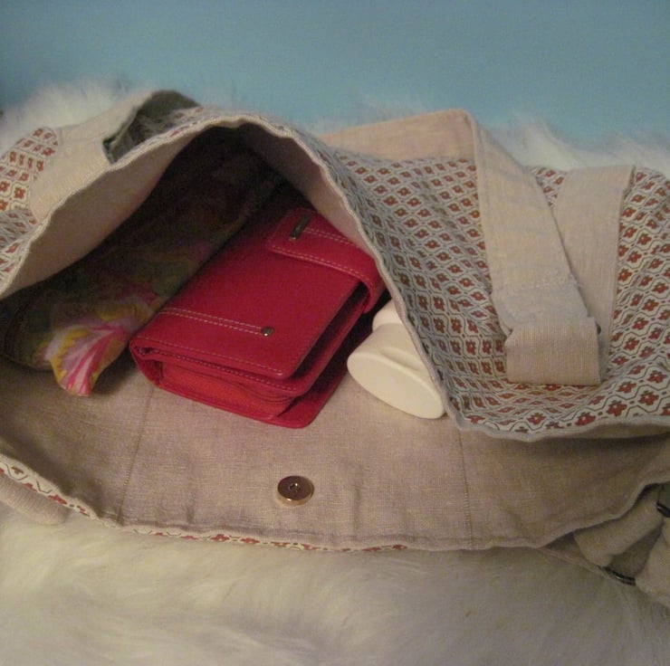 Made from a Laura Ashley outer cotton fabric in cream/orange/green and a linen beige lining, it is strong and very durable and fully washable. The large opening is secured with a metallic snap magnet. There is a deep outer pocket for items too which is also lined with the linen fabric. This is a very practical bag!