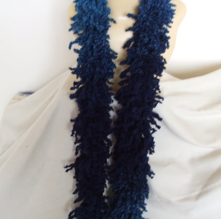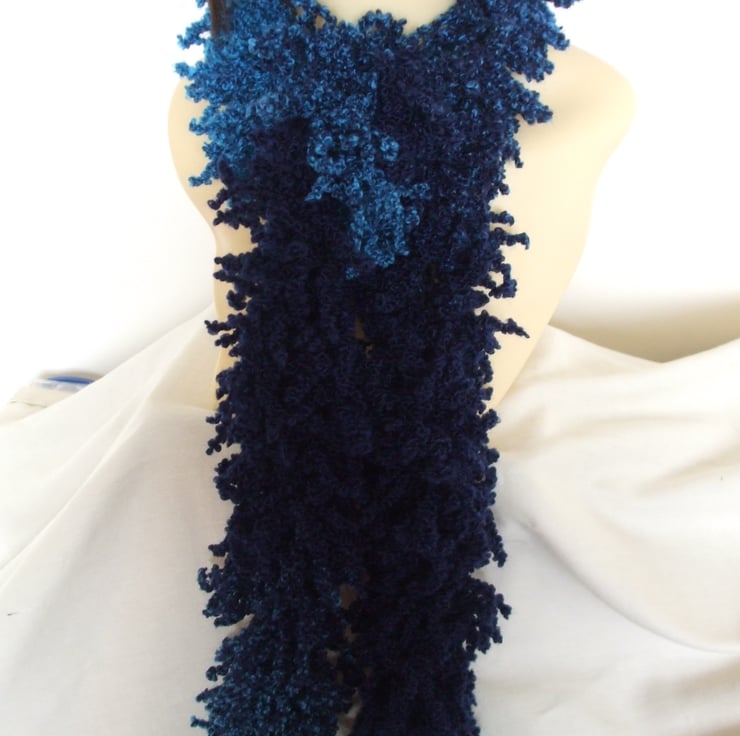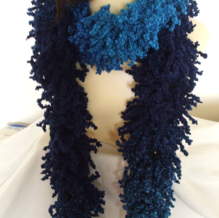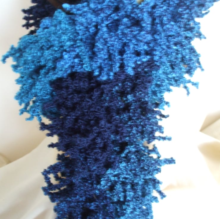 Hand knitted in a new yarn that creates a 'shaggy' look scarf