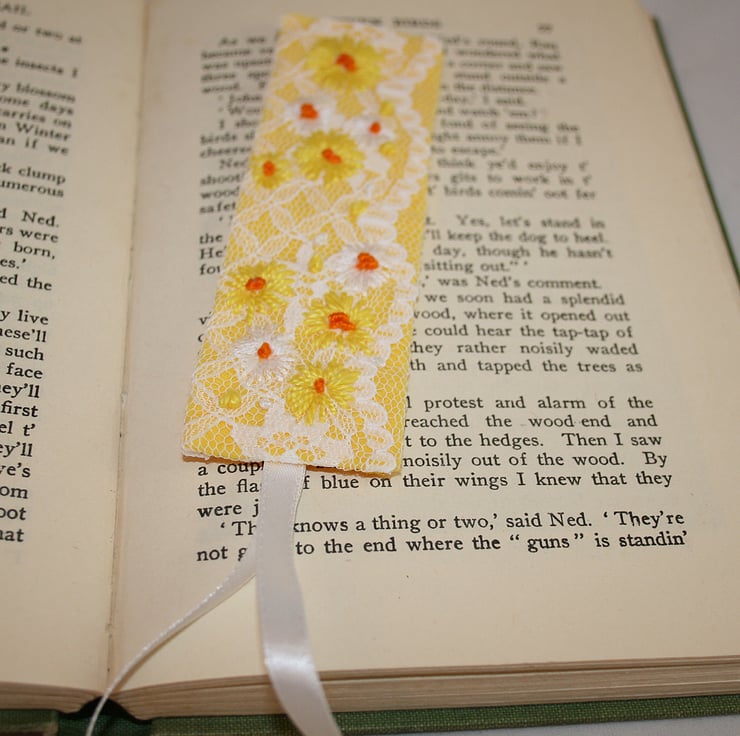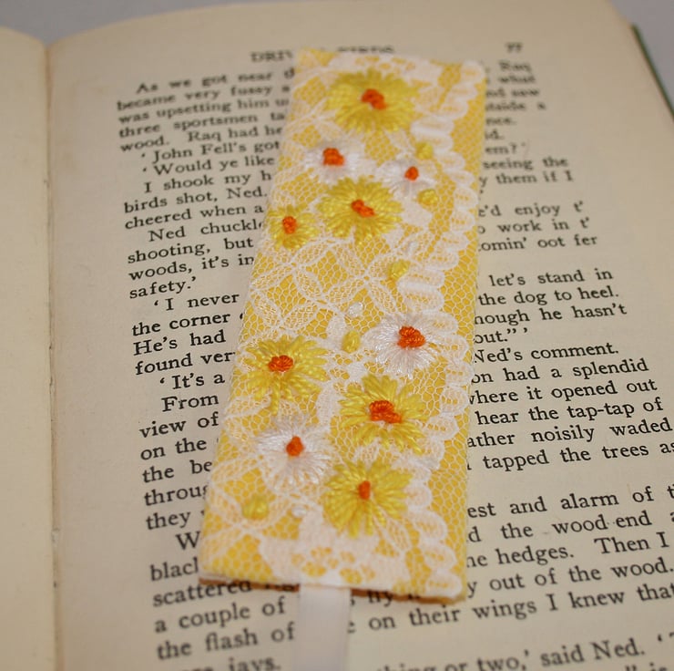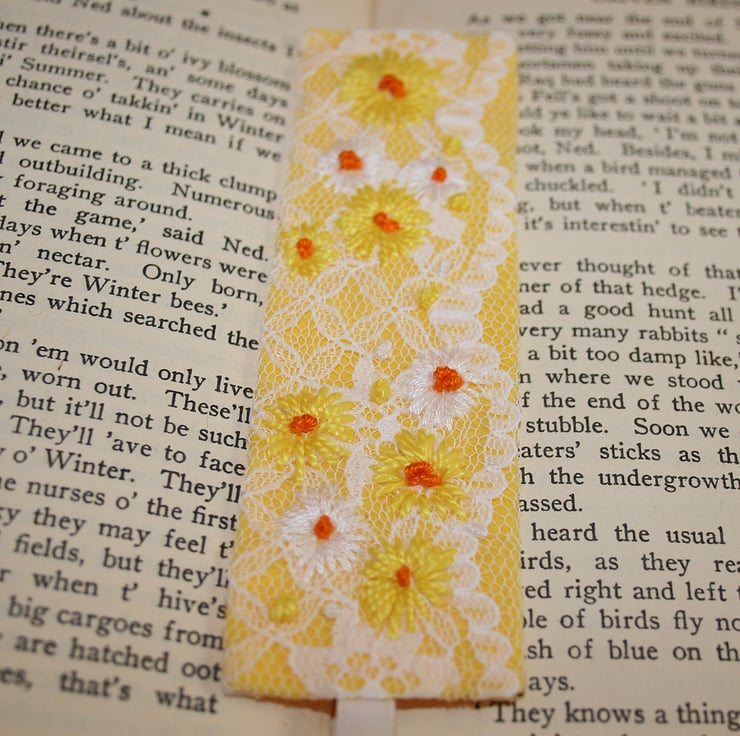 A length of pretty, white lace has been stretched over a piece of bright yellow felt and stitched in place. Yellow and white daisies, with cheerful orange centers have been embroidered at random across the bookmark, interspersed with 'buds' represented by french knots.