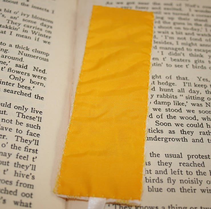 The bookmark is backed with a length of bright yellow ribbon, slip-stitched in place. White ribbon tails complete the design.