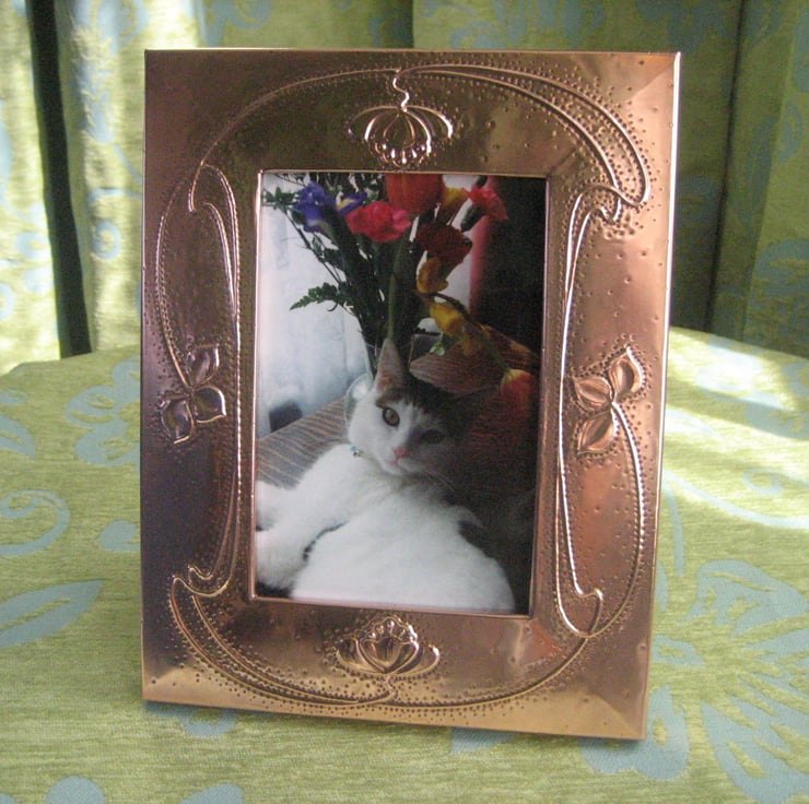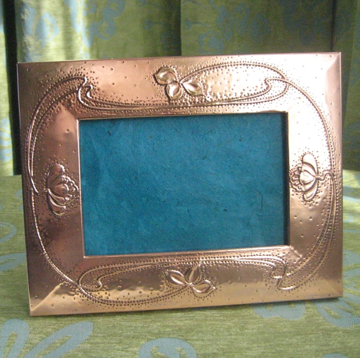 This frame has been handmade using the repousse method popular with the Arts and Crafts movement. The Art Nouveau design is asymmetrical and can be used with a portrait or landscape photo. It measures 173 x 220mm overall and will take a 4 x 6 inch photograph. The reverse, which is covered in black velour, has a stand and a rings for hanging in either position.