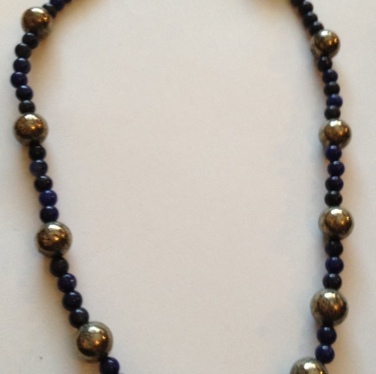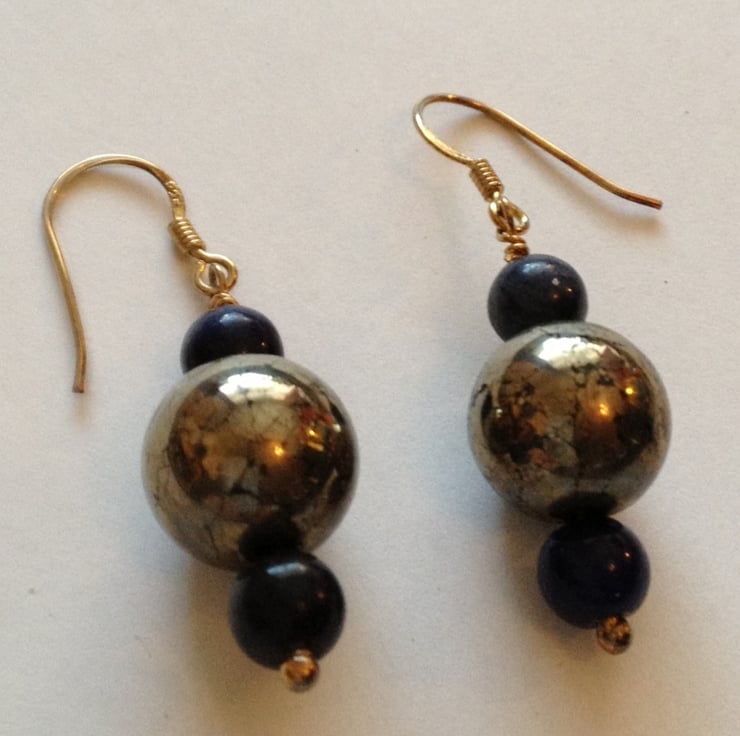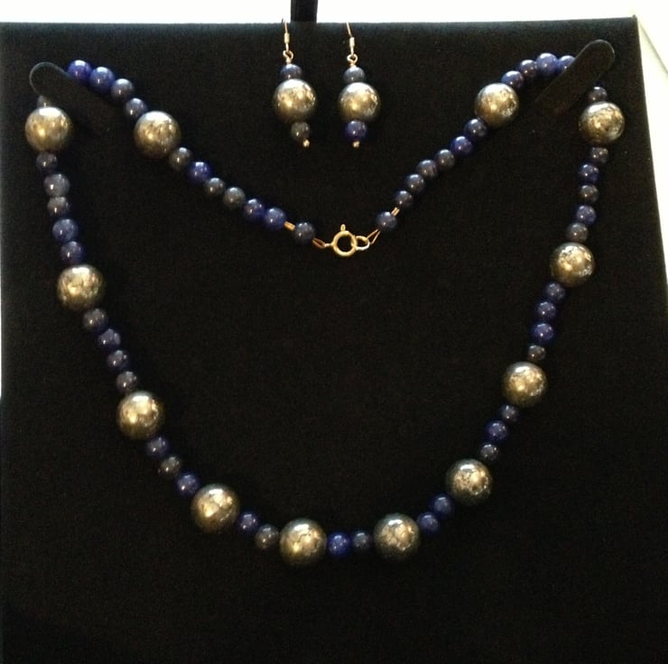Beautiful deep blue (reminiscent of lapis lazuli) aventurine bead necklace and earrings, highlighted by large globes of pyrite, set with gold plated findings on sterling silver.
