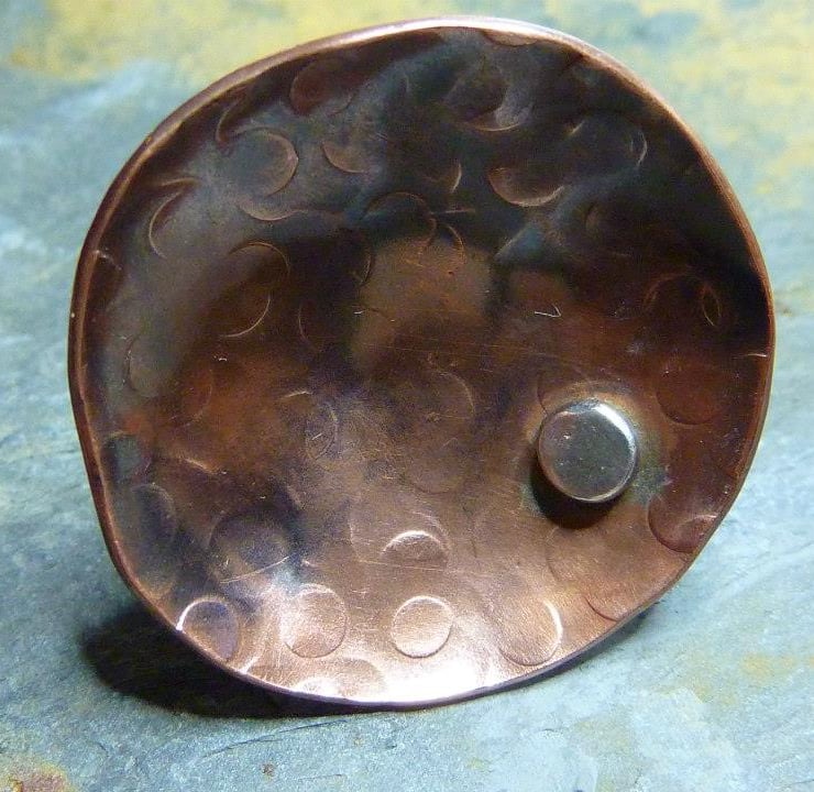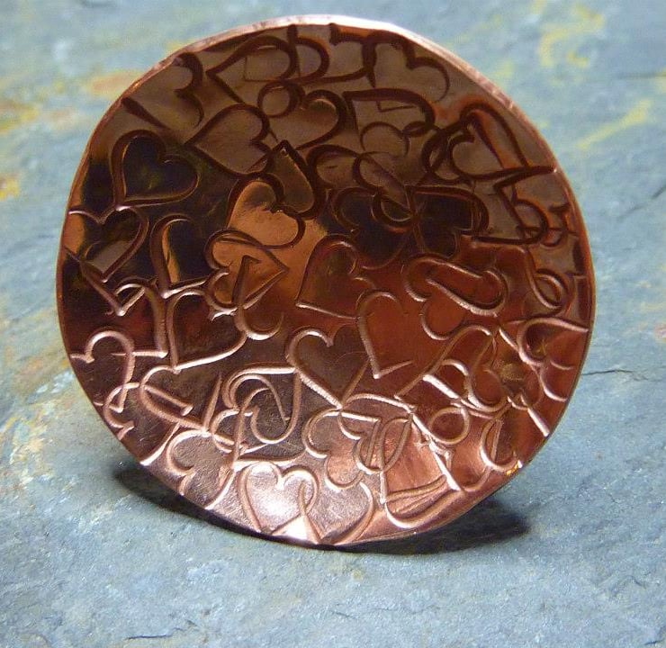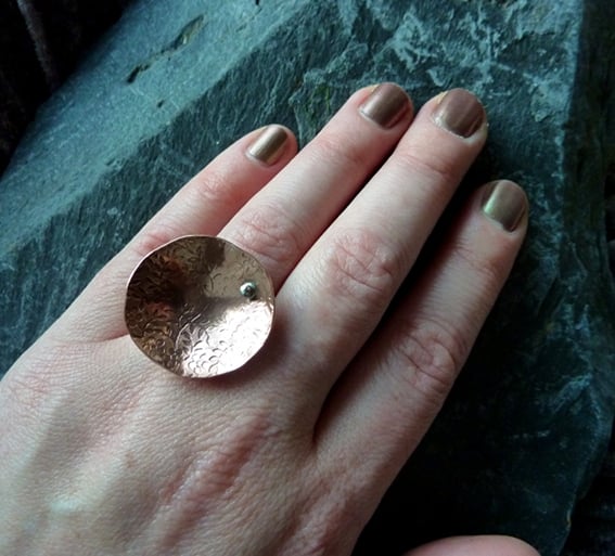 Your ring is polished to bring out the rich copper colour or it can finished with a patina (dots and circles ring) which gives the copper a lovely conker brown hue. Please specify pattern and finish when ordering.