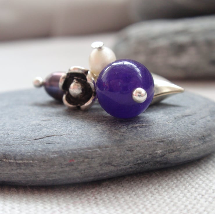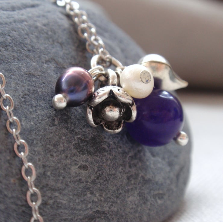 An amethyst cluster necklace with a purple amethyst bead 1cm across, silver plated heart, flower and freshwater pearls clustered together. Comes on an 18 inch sterling silver chain. Please let me know if you would prefer a different length chain or a snake chain.