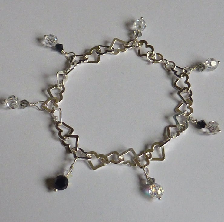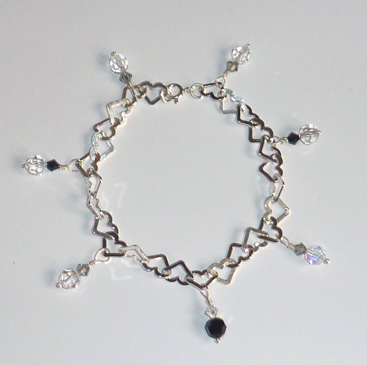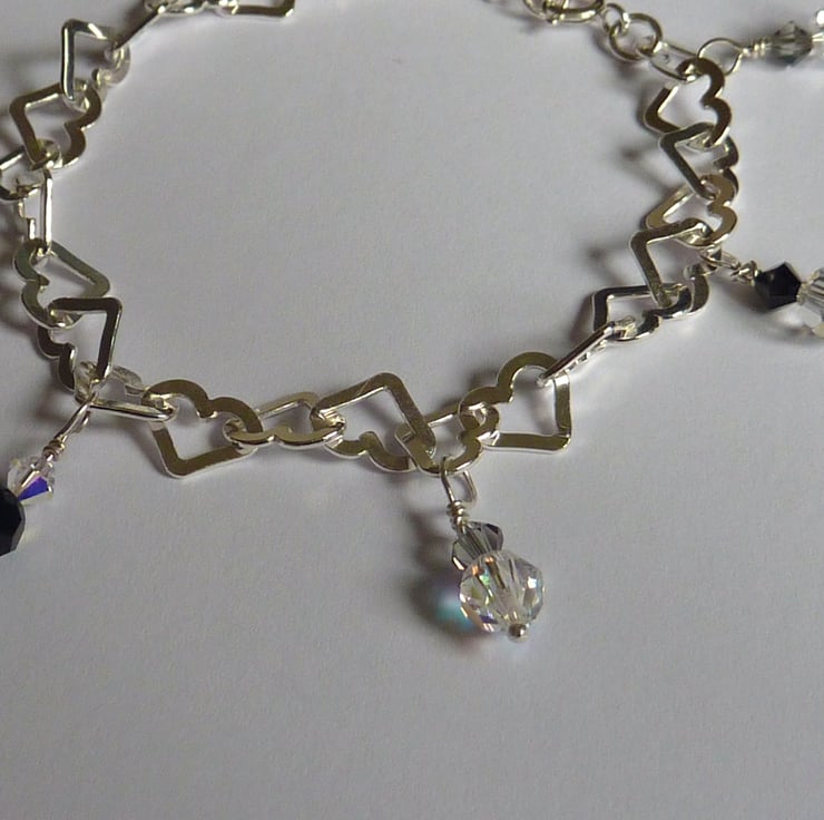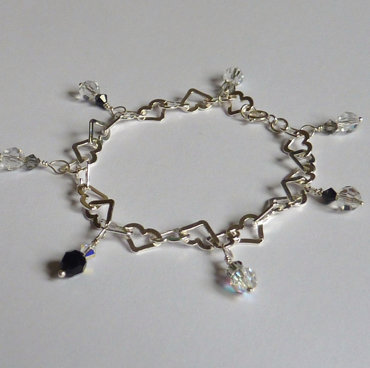 An open heart link sterling silver chain has been used to create this pretty sparkly bracelet. Clear, grey and black Swarovski crystals have been wire wrapped onto the bracelet with sterling silver wire to form the charms.
