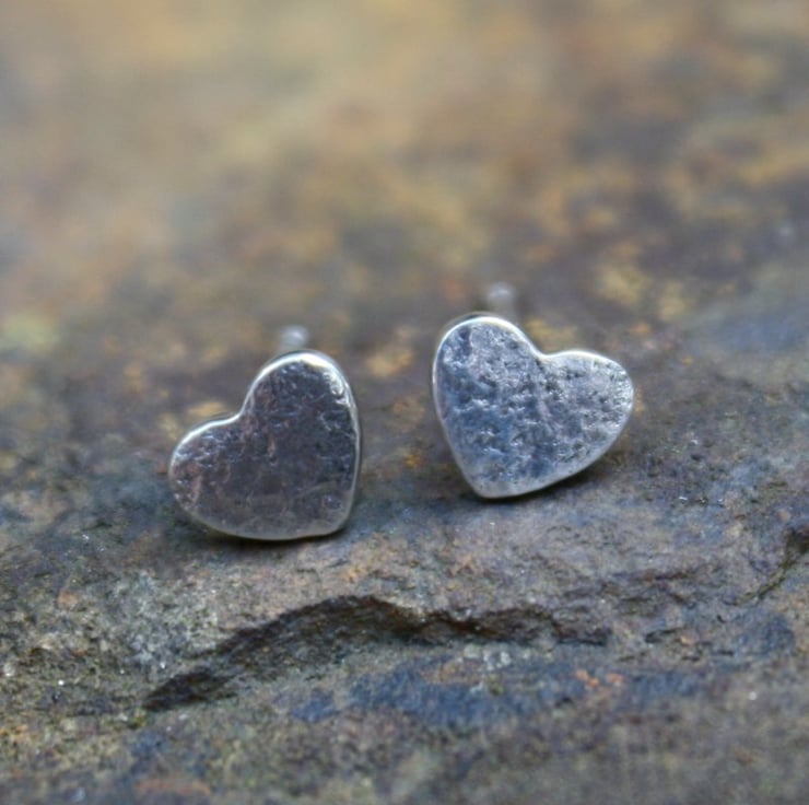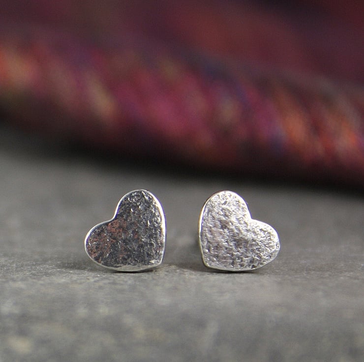 Small sterling silver heart shaped stud earrings with a hammered textured finish.