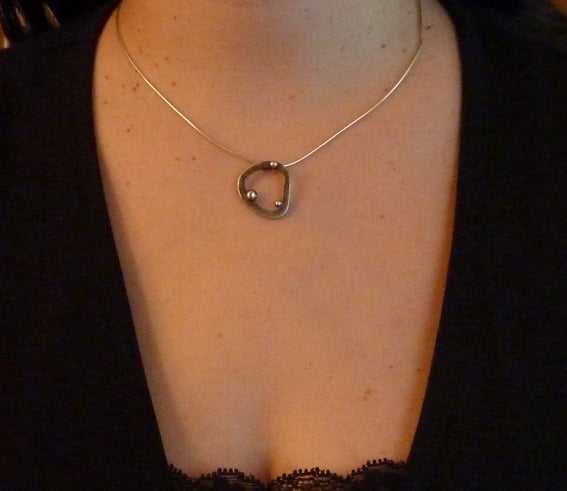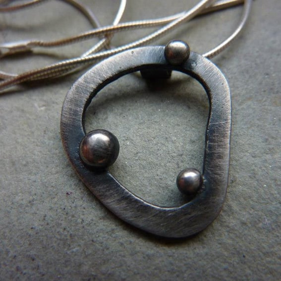 This pendant is part of the 'atomic' range and features three differently sized little silver 'atoms' on an irregular oval (which measures approximately 3cm at its widest point). The chain fitting is part of the pendant, making the necklace a complete construction.