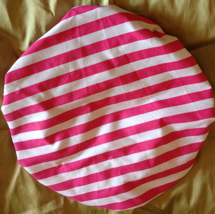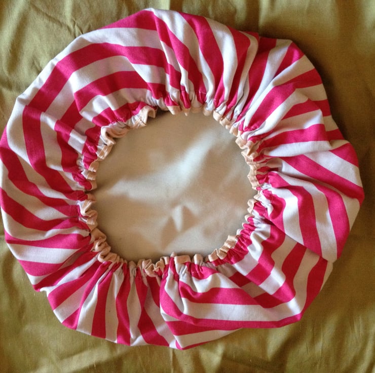 Pink and White cotton shower cap with trim and thick waterproof lining.