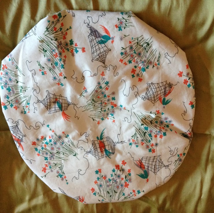 Birdcage print cotton shower cap with trim and thick waterproof lining.