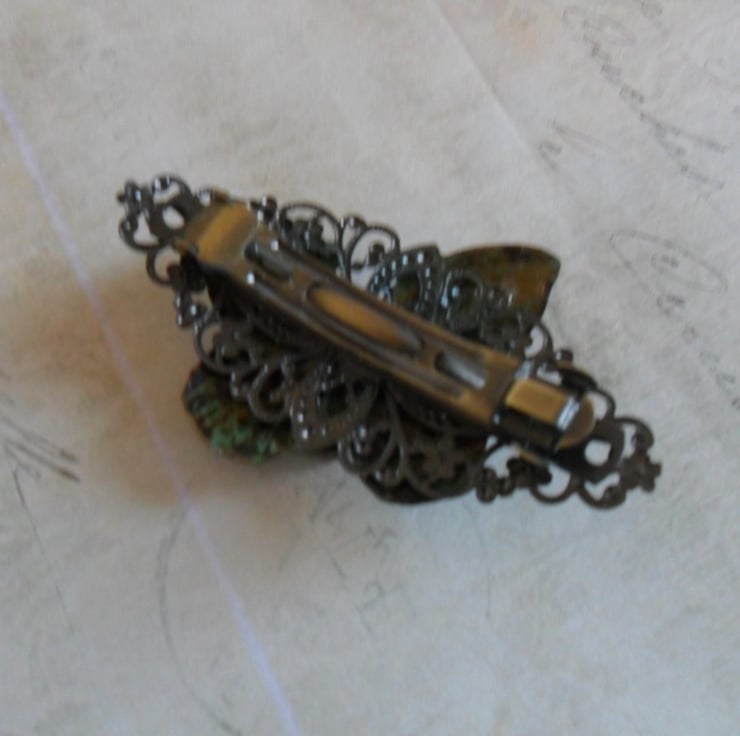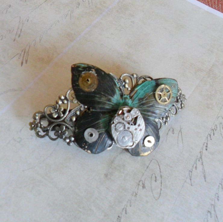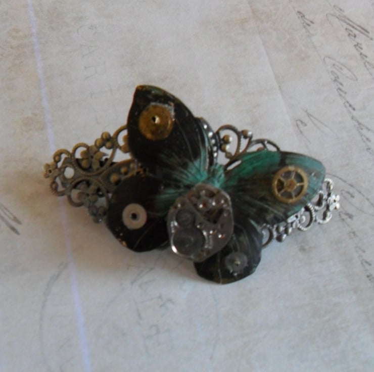 An unusual Steampunk hair barette created from a antiqued bronze filigree base with a silver combined with a detailed verdigris butterfly, adorned with vintage watch parts. To the centre is a vintage watch movement with all the wheels and gears on show.
