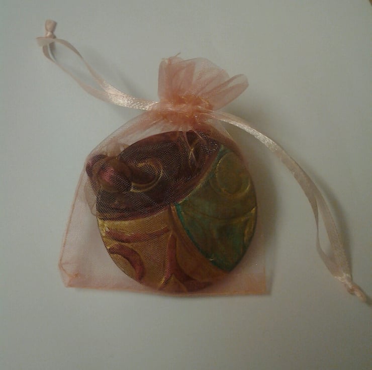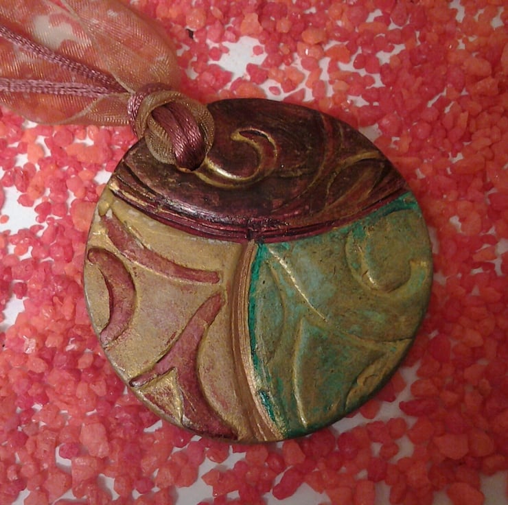 This unique pendant has been made using air drying crafting clay, which has been embossed with a decorative pattern giving a raised and textured finish to the design. It has then been painted with enamel paint in rustic colours, deep red, gold and green.