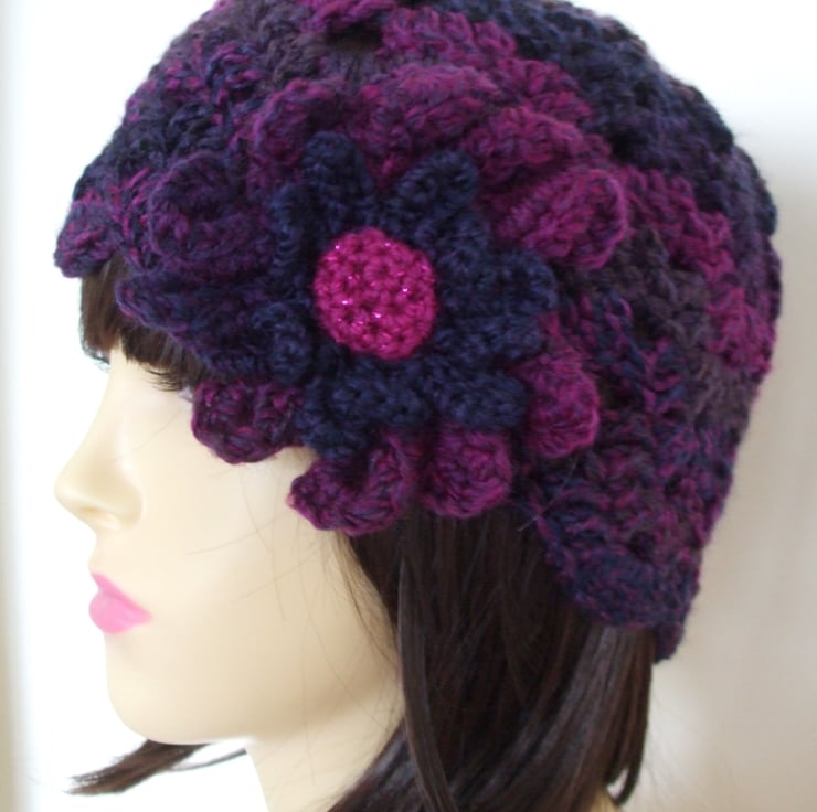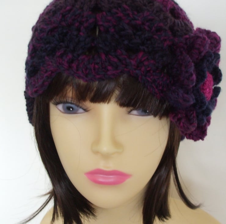 Hand crocheted hat is in a chunky random shaded purple yarn.