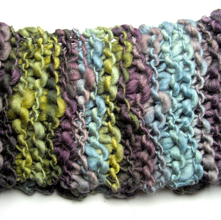 This lovely little scarf has been hand knitted from an attractive multi coloured fancy yarn with a luxurious feel. The yarn is 50% wool and 50% acrylic.