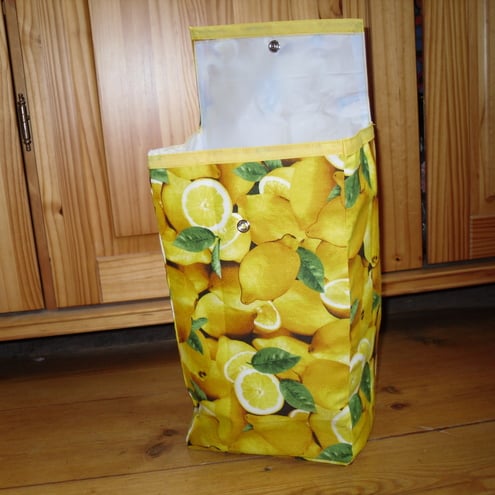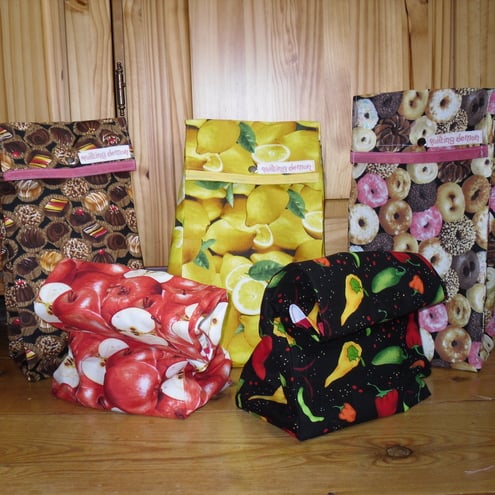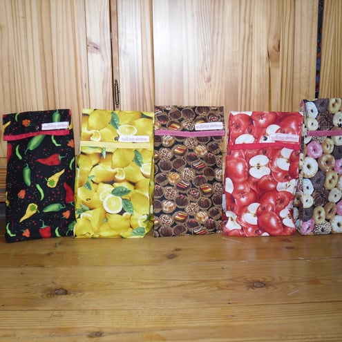 These wonderful lunch bags are created from some fantastic food themed fabrics. They have a waterproof, wipe clean lining, with a removeable,covered cardboard base, and a snap fastener to close.