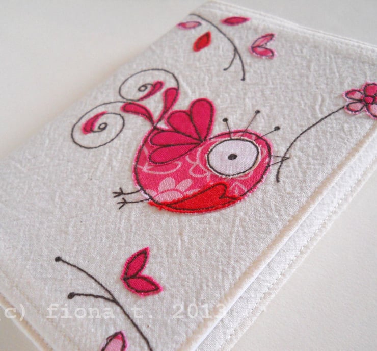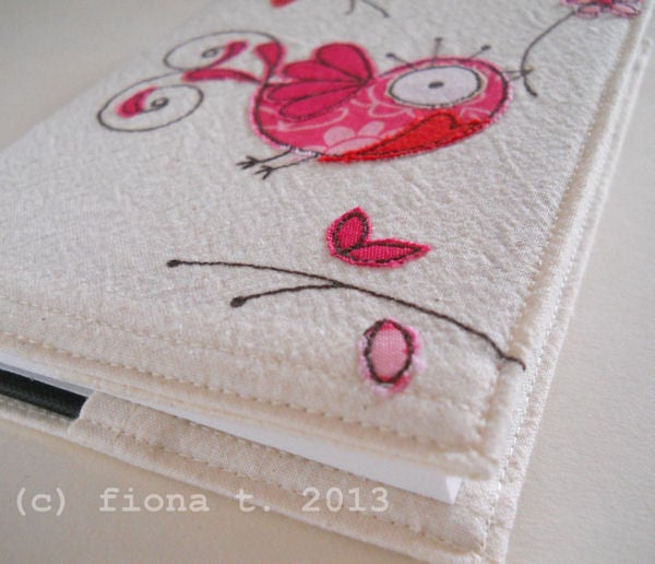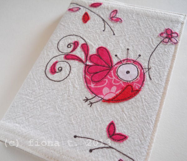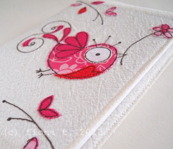 this pretty notebook cover features an appliqued and embroidered peace dove on the front cover. based on an original drawing by Little Black Heart, it is entirely handmade by me on a domestic sewing machine.