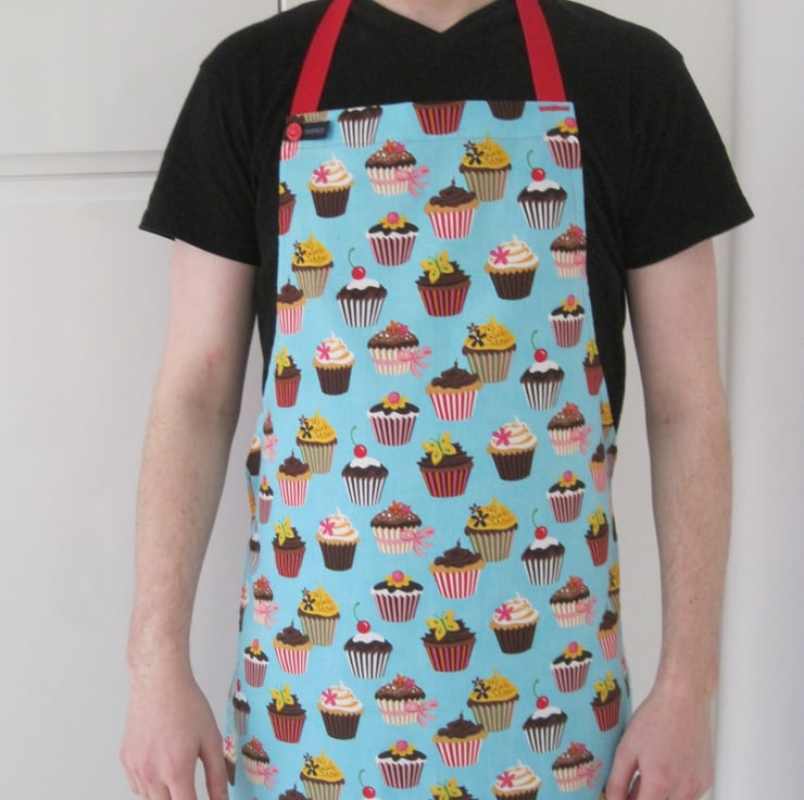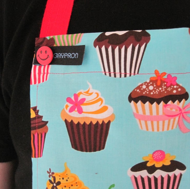 GAYPRONS - Aprons for men and women in the blue version of the Robert Kaufman Sweet Tooth Cupcakes Fabric.. Very cute and very popular...
