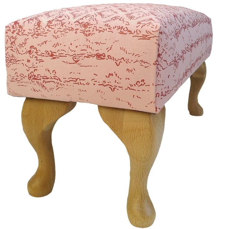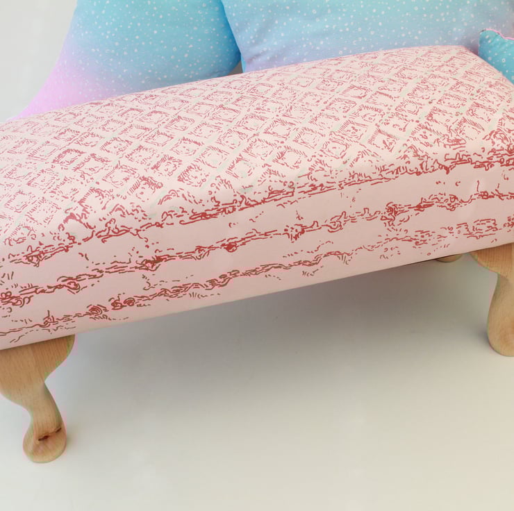 This pink wafer biscuit footstool is a feast for your eyes, put your feet up in comfort whilst enjoying a cup of tea and a biscuit for yourself. The colourful design is based on a detailed illustration of the pink wafer biscuit by illustrator Simon Lewis. The two colour biscuit design is then screenprinted onto a heavy cotton fabric, which is then upholstered and made into a footstool. The high quality Queen Anne legs are a beech wood with a clear varnish to give a natural finish. The pink wafer footstool is handmade in Leeds, and all parts have been supplied locally where possible, or from within the UK. The dimensions are 55 x 22 x 35cm approx. The underneath is covered in a dark grey fabric and all coverings and materials comply with fire safety regulations.