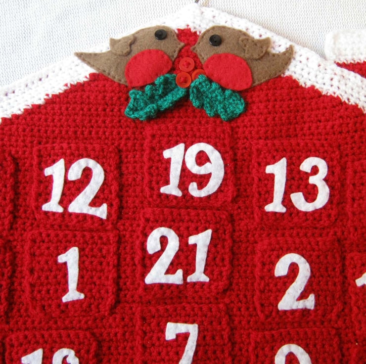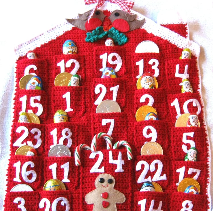 Red house design with individual pocket for each day. Templates are included in the pattern to make the felt robins and gingerbreadman.