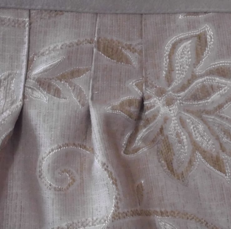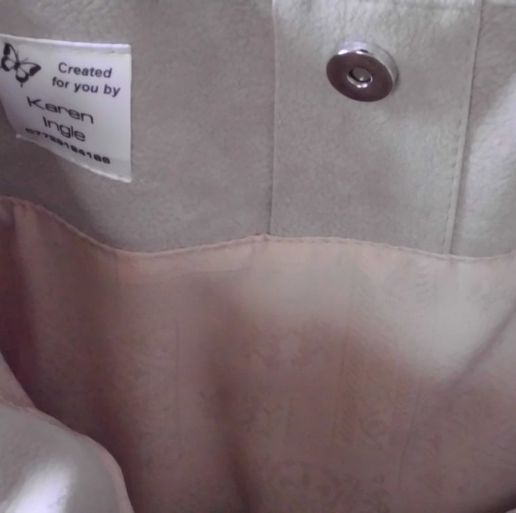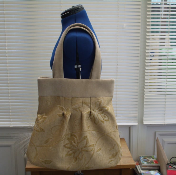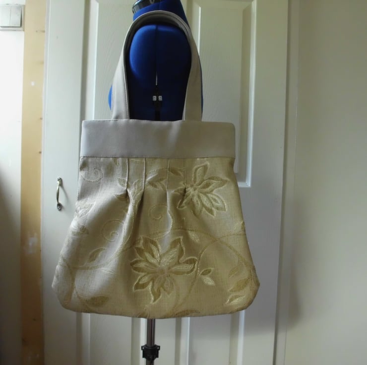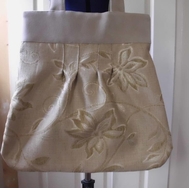 Gold flower design tote bag made from soft furnishing fabric which has a chenille feel to it four stitched pleats to give shape to bag, yoke and handles are made from cream fawn faux suede fabric. lining made from cream cotton with a pattern design two patch pockets for keys or mobil phone .it has a magnetic clip . This bag is a nice size looks good with any thing it is very dressey .