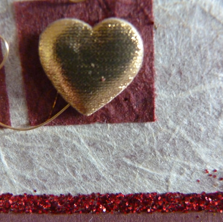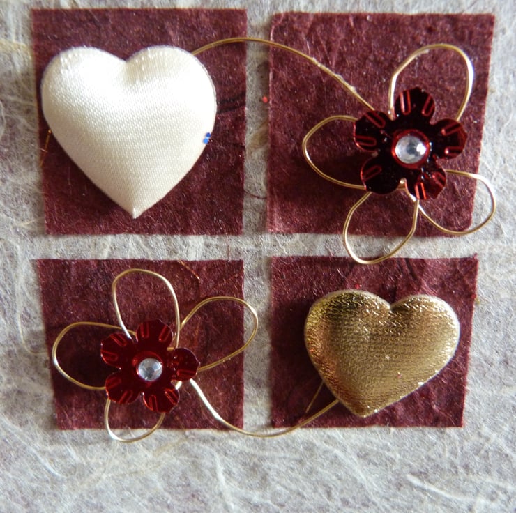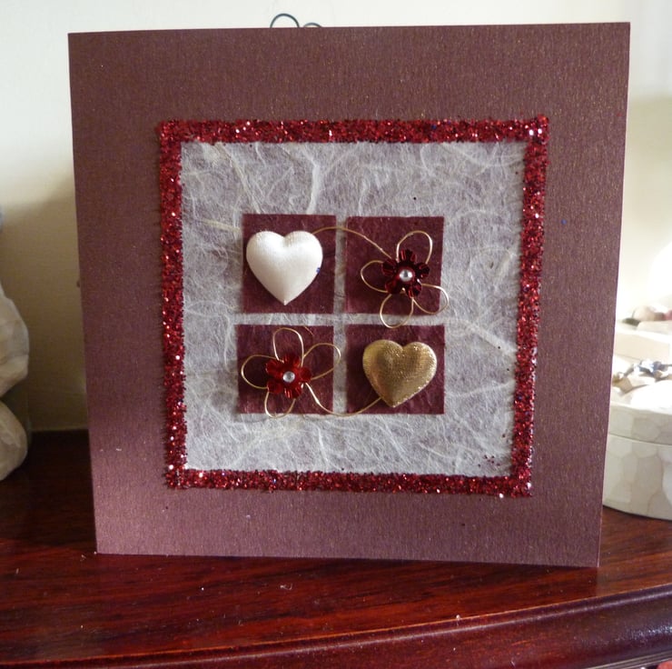 Four dark red squares of hand made paper mounted onto a square of white hand made paper and then mounted onto dark red sheen quality card. Two fabric hearts one cream and one gold mounted onto the small squares along with two handmade flowers made from gold wire, red sequins and silver gems. Further decorated with fine red glitter