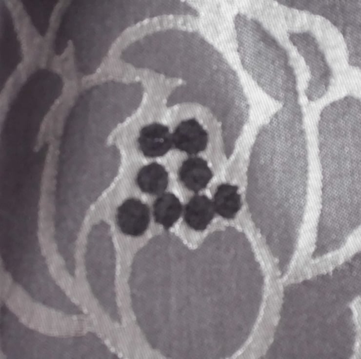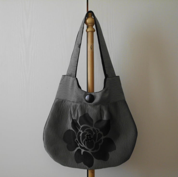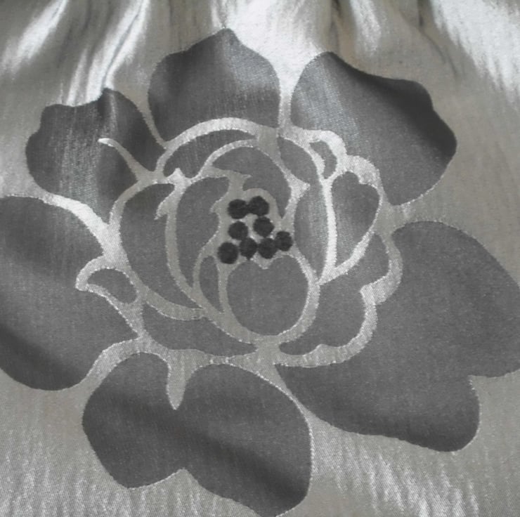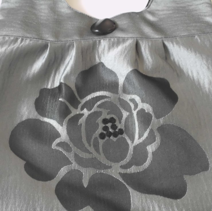 Hand bag in Faux slik sliver grey fabric with a black flower design on both sides of bag . It has 4 stitched pleats to give shape . Lining is black cotton with 1 patched pocket for keys and phone. magnetic clip with large black button on yoke of one side of bag where magnetic clasp is. This bag is a any time hand bag looks nice for day or evening it's a nice size very dressy .