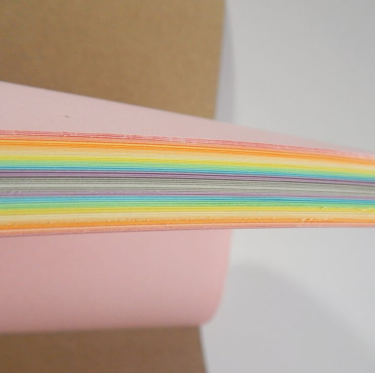 The book contains 32 pages (64 sides) of paper, four each of eight different pastel shades, arranged in a rainbow.