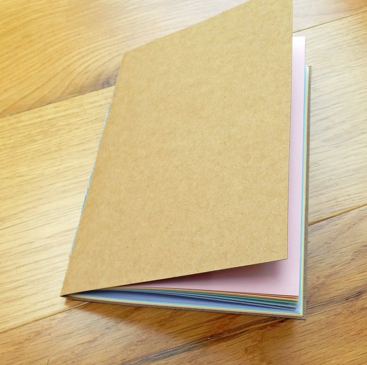 A large, A5-sized notebook or journal, in a moleskine style, with covers of kraft card and a rainbow of pastel coloured paper inside. Made to order specially for you.