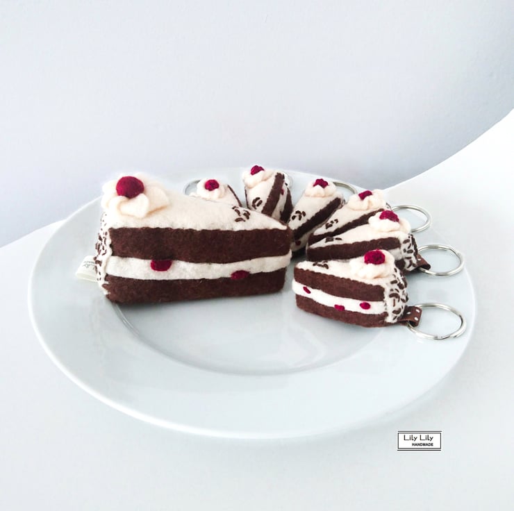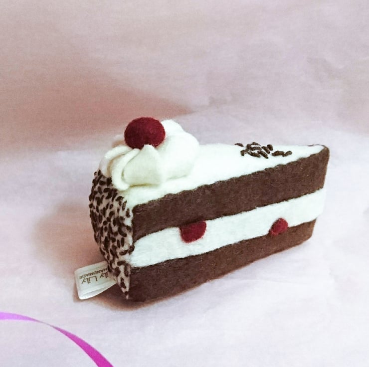 A quirky and cute Black Forest Gateaux chocolate cake handcrafted from felt by Lily Lily Handmade...a calorie-free afternoon tea treat! A mouth watering combination of chocolate sponge, fresh cream and black cherries, decorated with embroidered chocolate curls. The chocolate patisserie felt cake has been designed and hand-crafted as a pincushion but is also ideal as party decorations, home decor, a birthday keepsake, a gift for a crafter or special unique wedding favours.
