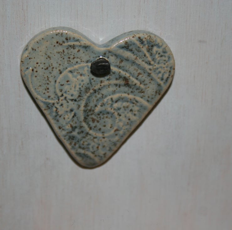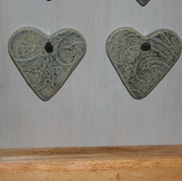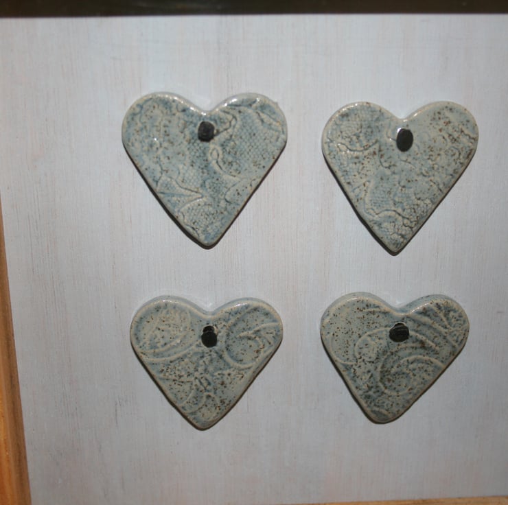 Wooden picture frame containing four small handmade ceramic lightly textured stoneware hearts, glazed in a speckled blue colour. Picture frame has been treated with bees wax & highlights texture of wood, ceramic hearts have been applied & tacked using small black pins to a wooden back drop which has been lightly washed with blue colour.